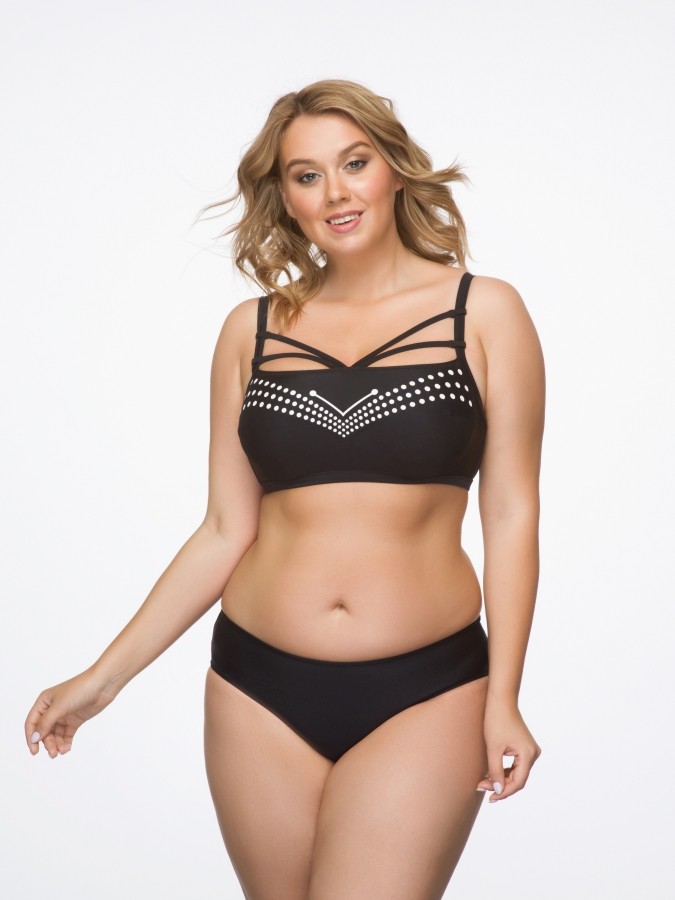 Раздельный купальник на каркасах с мягкой чашкой без уплотнения выполнен из однотонной ткани. Апликация на лифе формируют красивый силуэт. Лиф полностью дублирован подкладочной тканью .Декоративные полоски на лифе можно сдвинуть к верхней части лифа. Бретели с регуляторами и широкая металлическая застежка позволяет идеально подогнать посадку лифа на любую грудь. Боковая косточка не позволяет скатываться ткани на боку лифа. Трусы средней посадки   полностью дублированы подкладочной тканью.