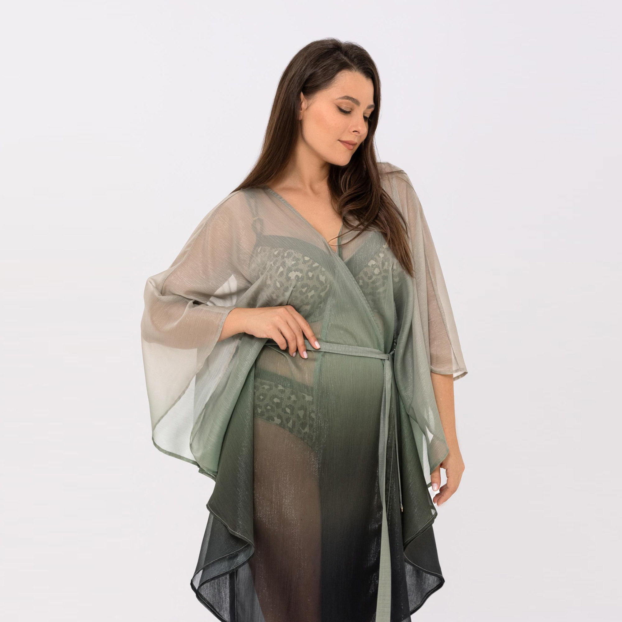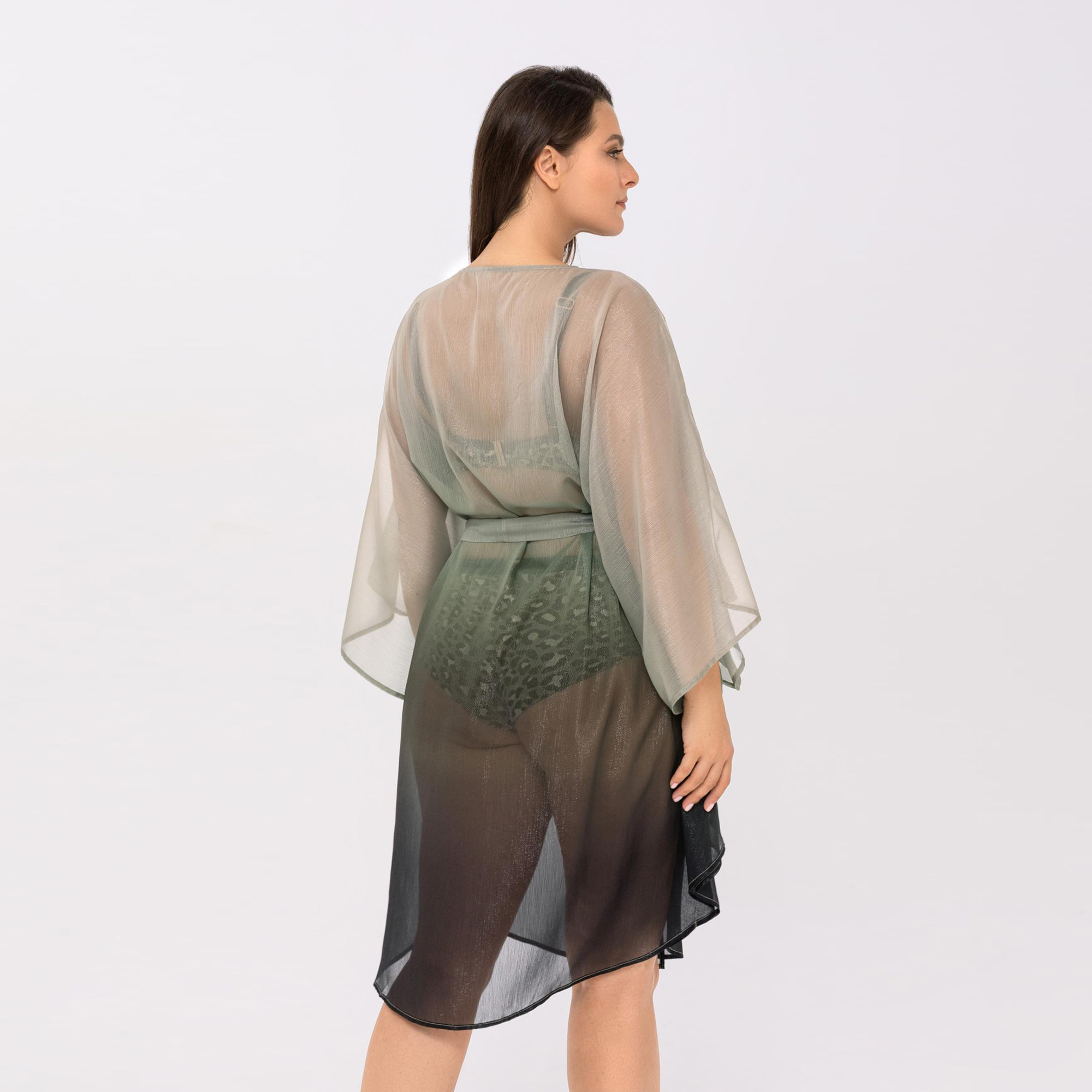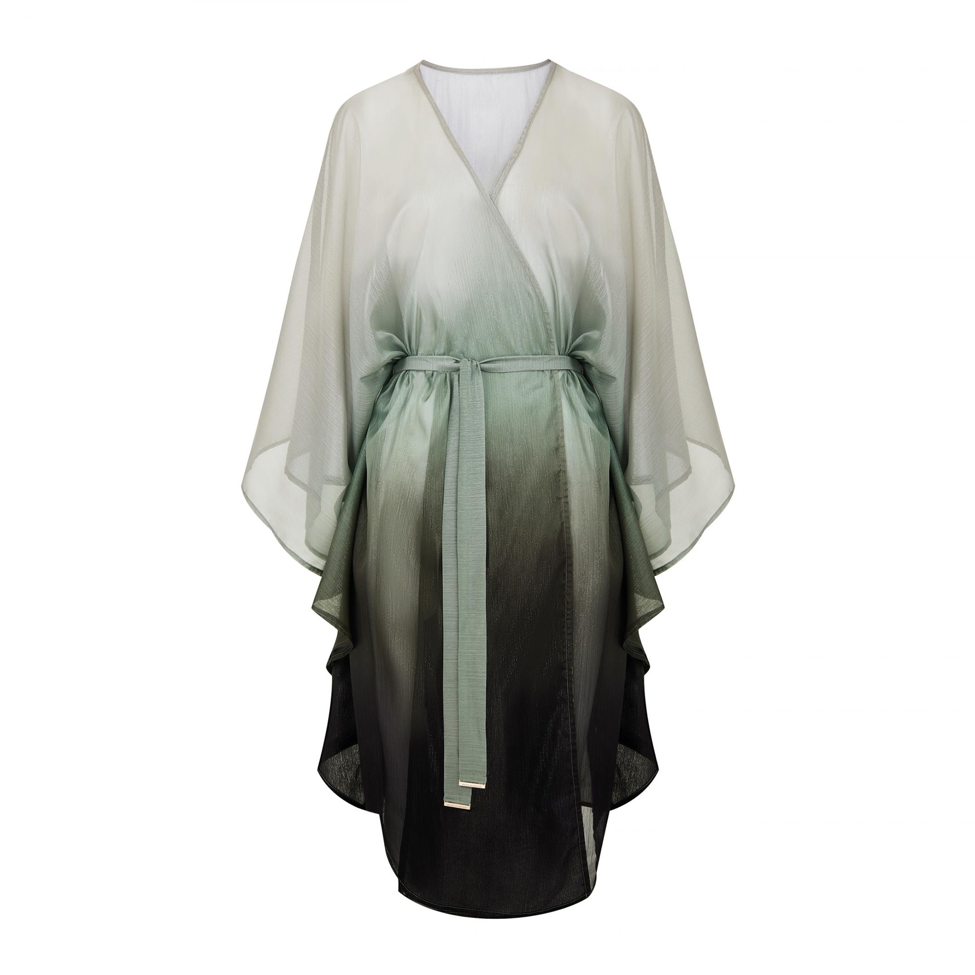 Летняя туника свободного кроя с эффектом «омбре», длина до уровня колен. V-образный вырез горловины. Рукава напоминают крылья бабочки. Съемный пояс.
