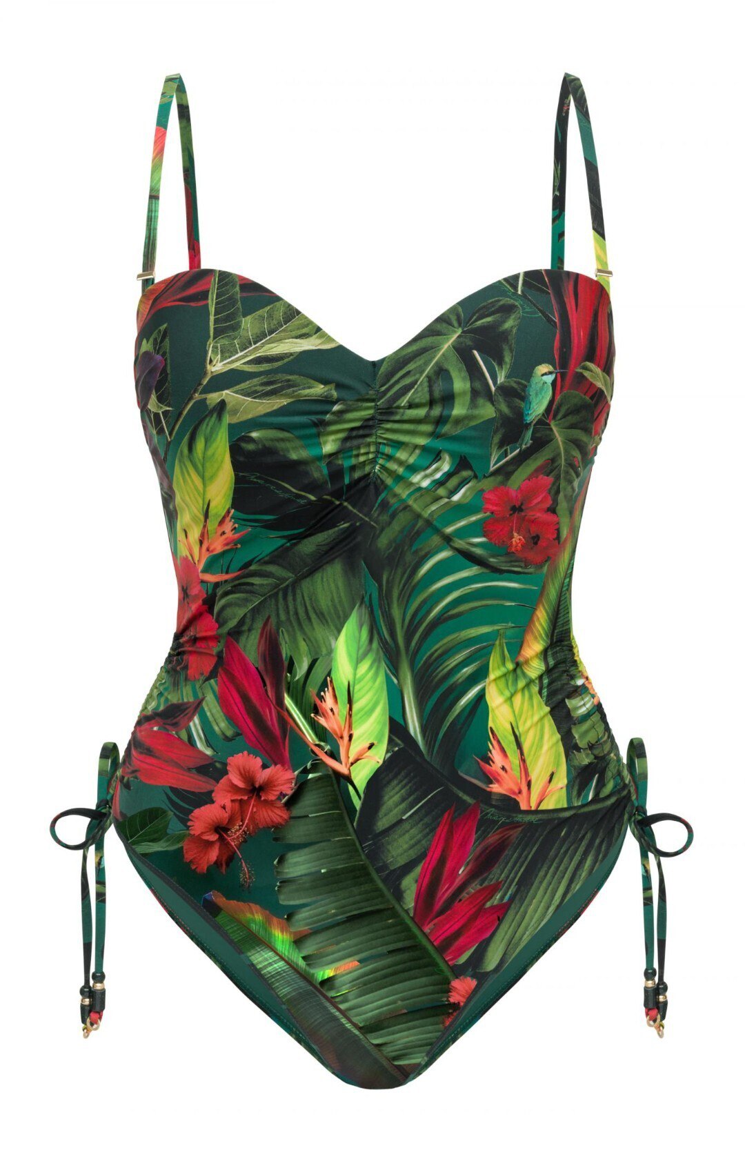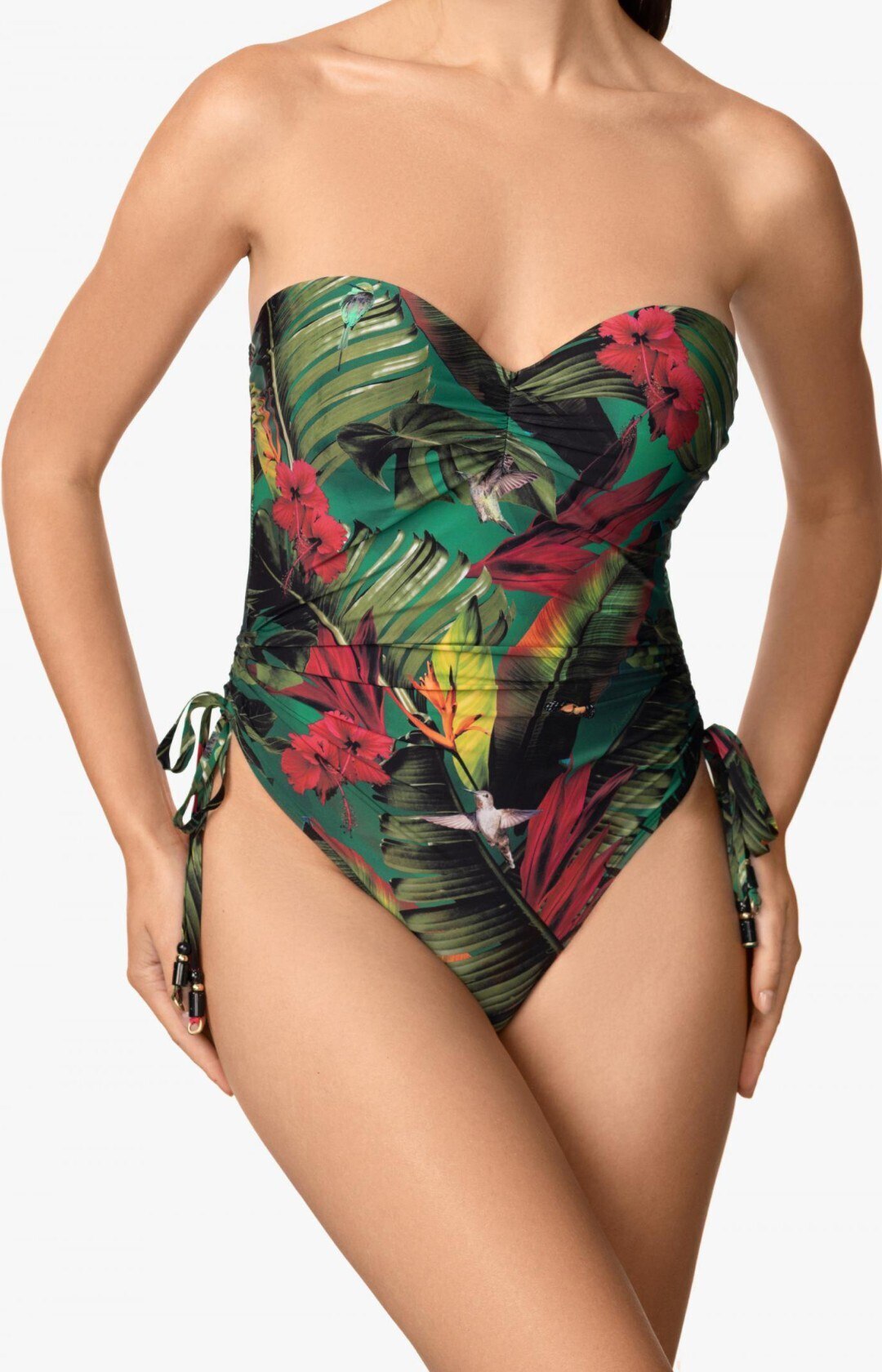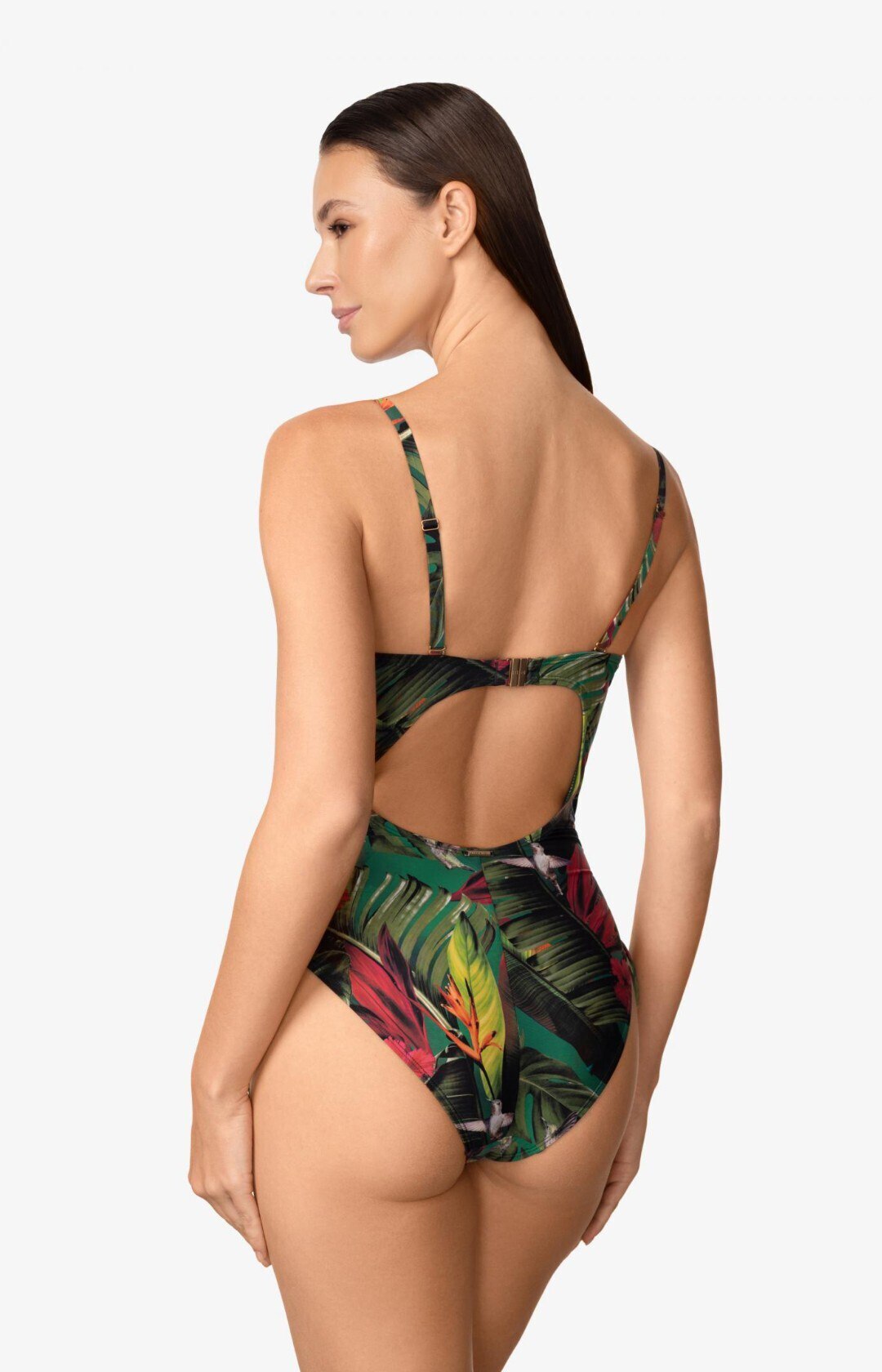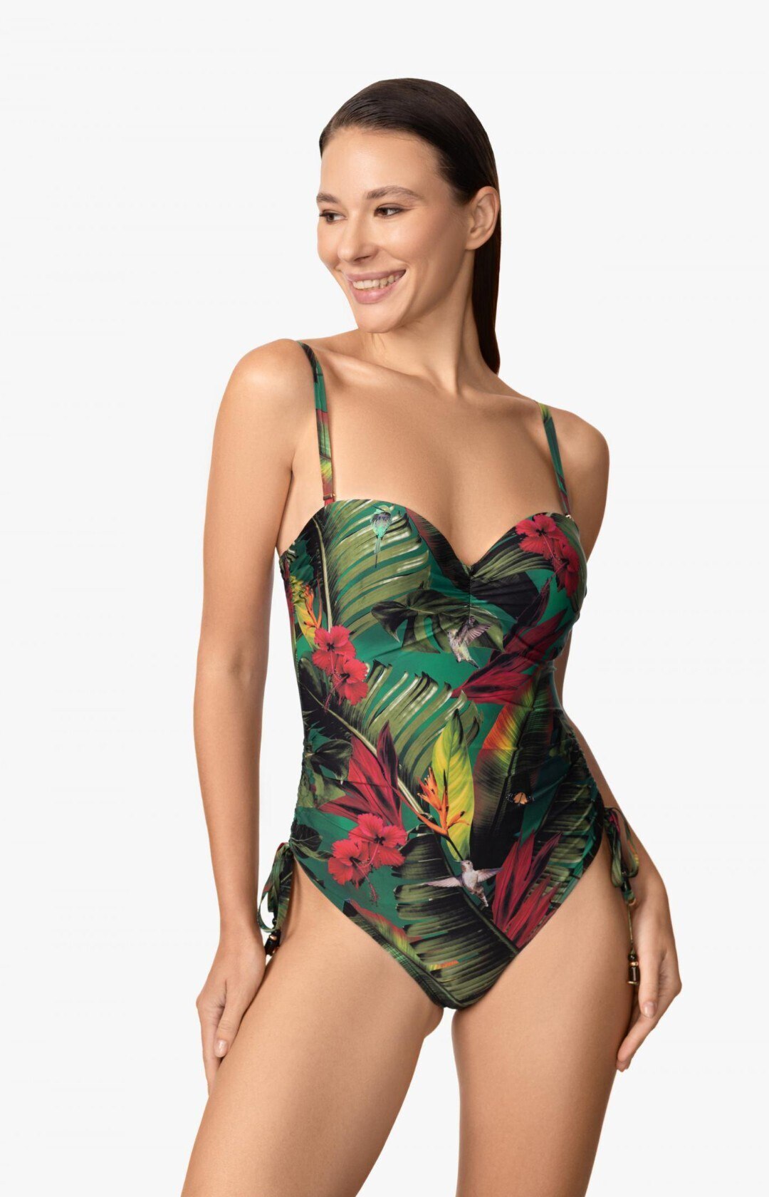 Формованная чашка «бандо» на каркасной поддержке обеспечивает идеальную форму и надёжную поддержку. Съёмные бретели дают свободу выбора, позволяя носить модель разными способами. Открытая спина с застёжкой создаёт лёгкий и соблазнительный силуэт, а регулируемая высота боков с помощью кулисок позволяет подстроить посадку под любую фигуру.