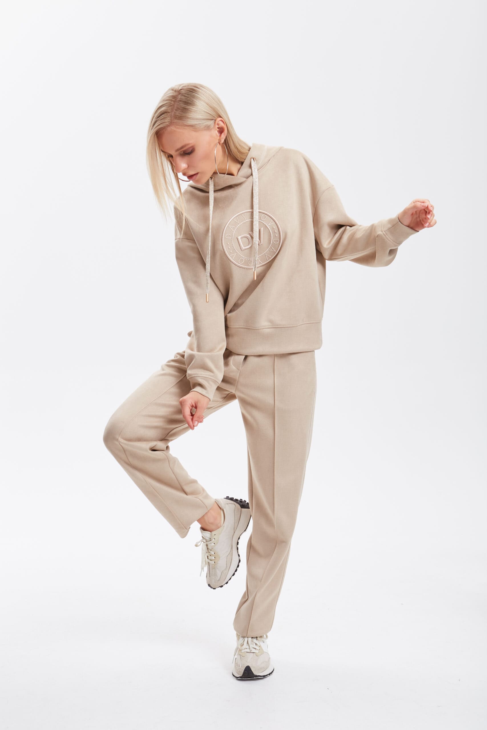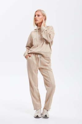 Брюки с посадкой на талии, длиной до щиколотки, заужены к низу. Передние половинки с карманами, наклонными к боковым швам, по центру застрочены канты. В среднем шве имитация застёжки. Задние половинки с нефункциональными карманами с листочкой. Пояс с эластичной тесьмой, прострочен двумя параллельными строчками, с втянутым шнурком из основного полотна. По боковым швам прострочена отделочная строчка с застилом.