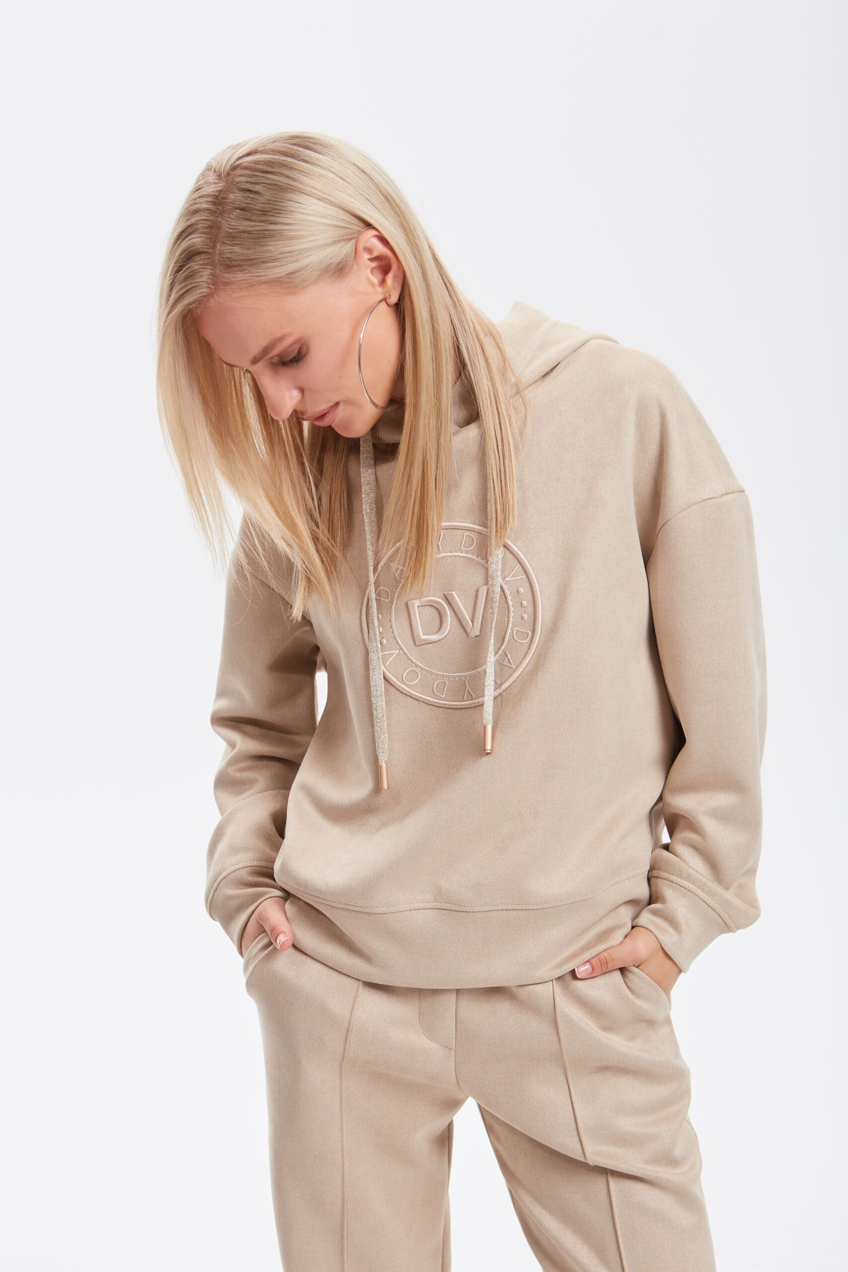 Джемпер свободного кроя, со спущенной линией плеча, длиной ниже линии талии, присобран по низу притачной планкой. Перед с дизайнерской вышивкой. Спинка без особенностей. Горловина округлой формы с глубоким капюшоном, по переднему краю которого отстрочена кулиса и втянут шнурок из основного полотна. Рукава длиной до запястья с манжетами. По плечевым швам, по шву притачивания планки низа, манжет и капюшона прострочена отделочная строчка. По среднему шву капюшона и по переднему краю — отделочная строчка с застилом.