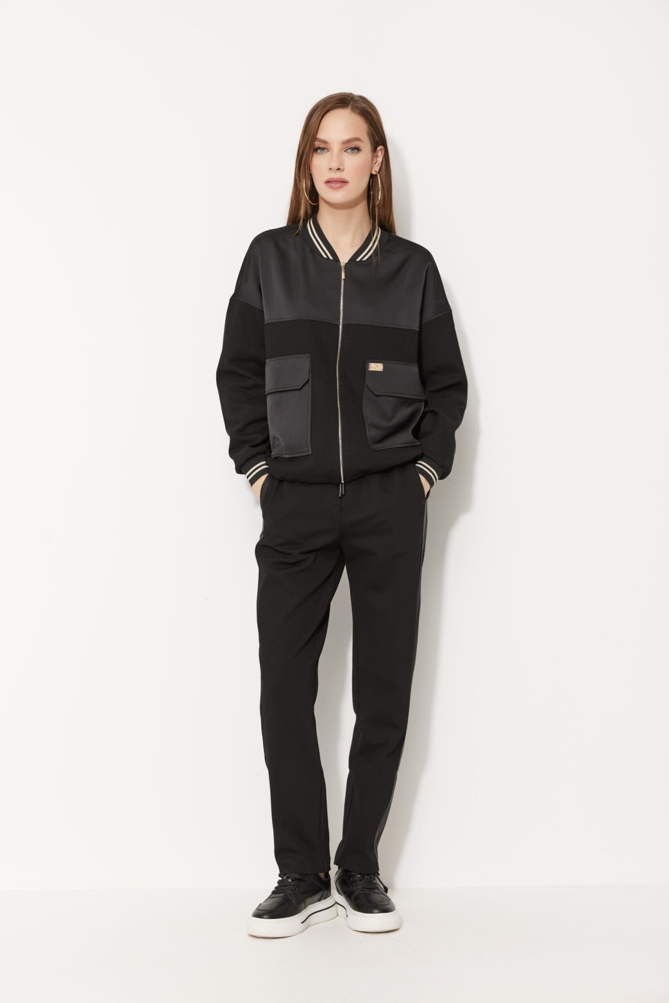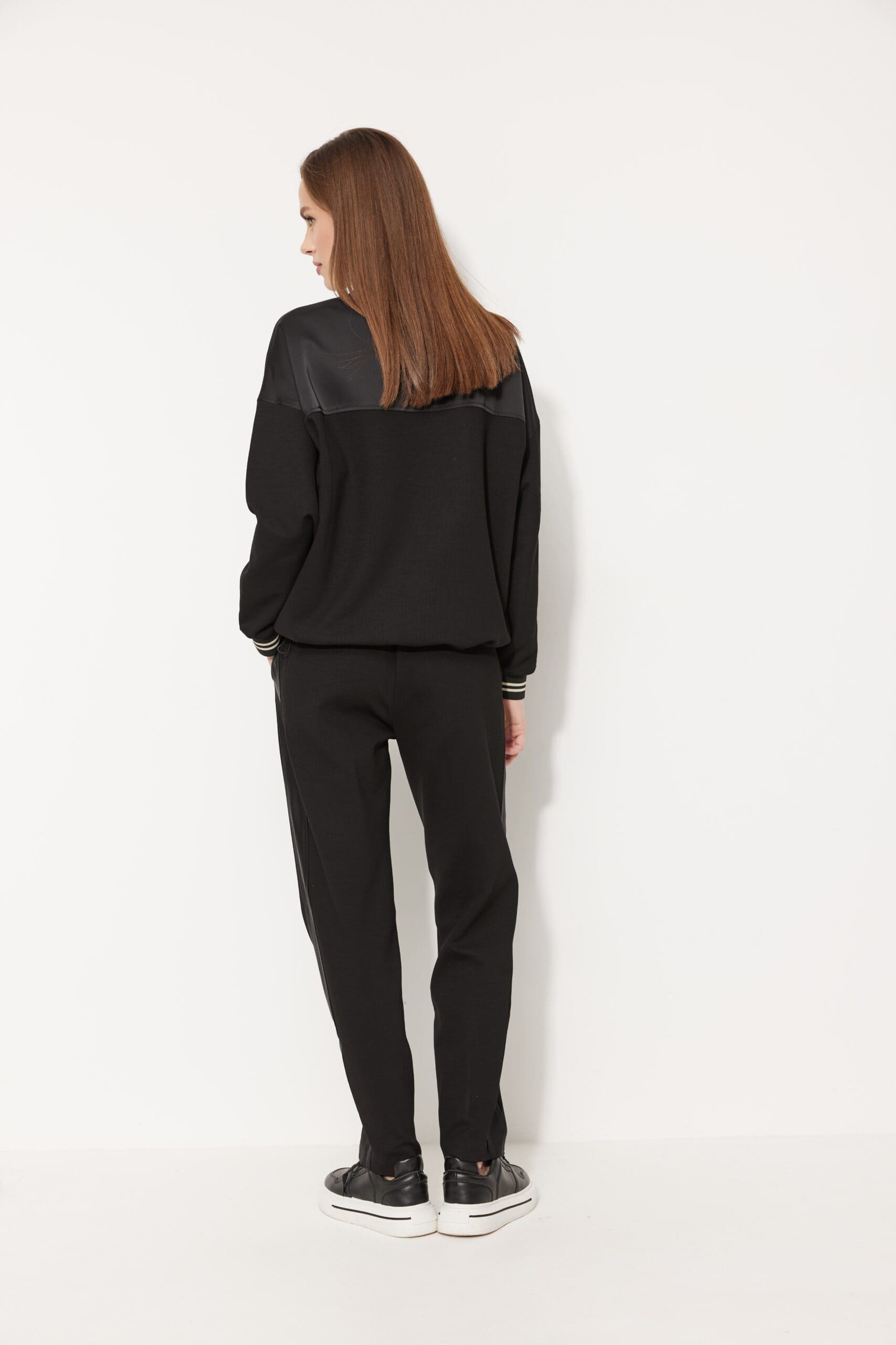 Брюки с посадкой на талии, длиной чуть выше щиколотки, заужены к низу, с лампасами по боковым швам. Передние половинки с вертикальными карманами с листочкой, расположенными на уровне бёдер, вдоль боковых швов. Пояс с эластичной тесьмой, застроченной двумя параллельными строчками. По центру пояса люверсы, через которые втянут декоративный шнур. По швам притачивания лампасов прострочены отделочные строчки.