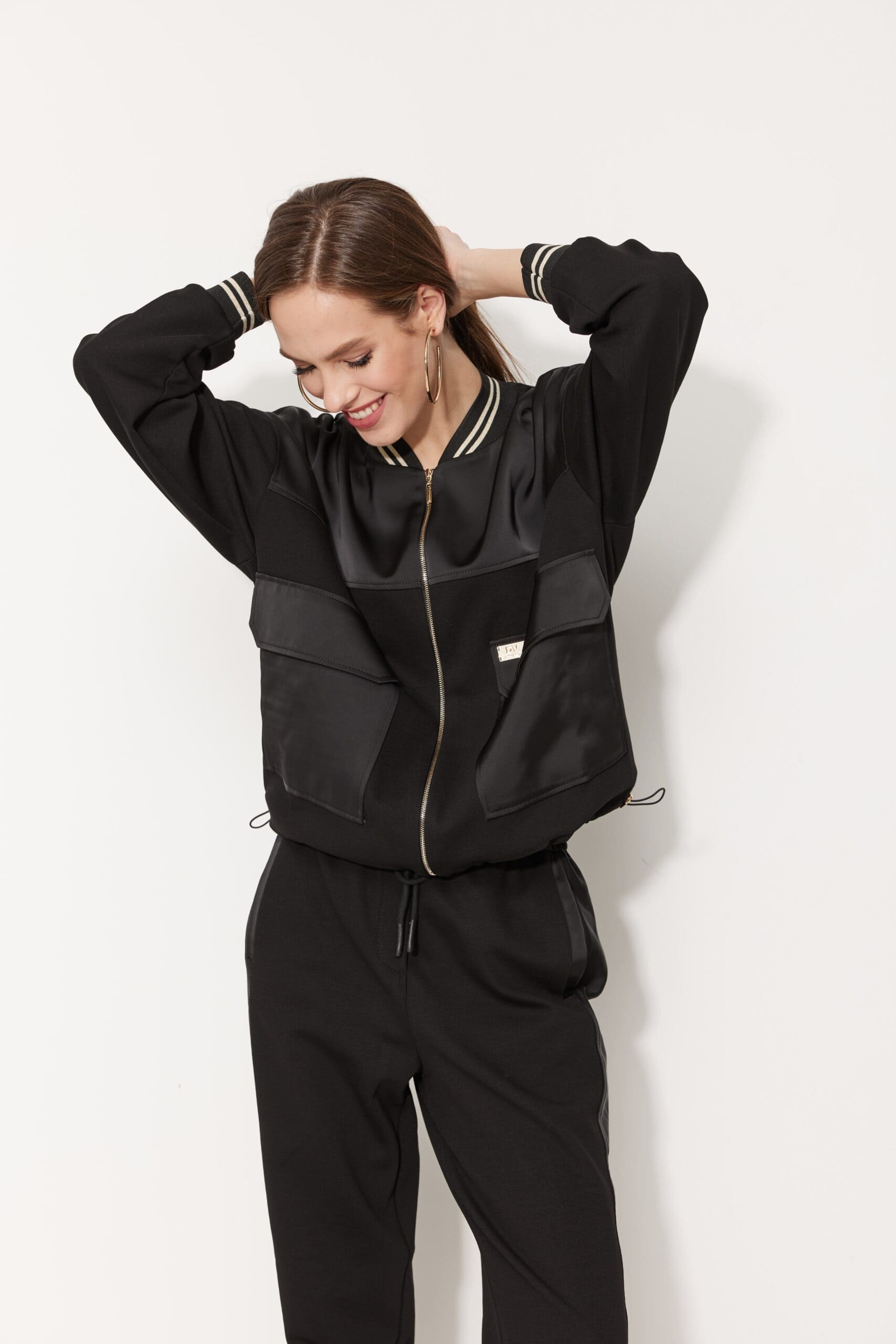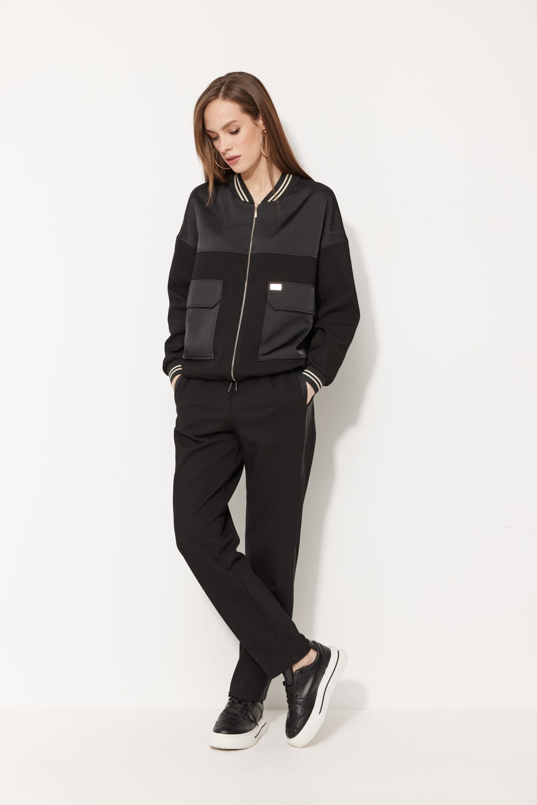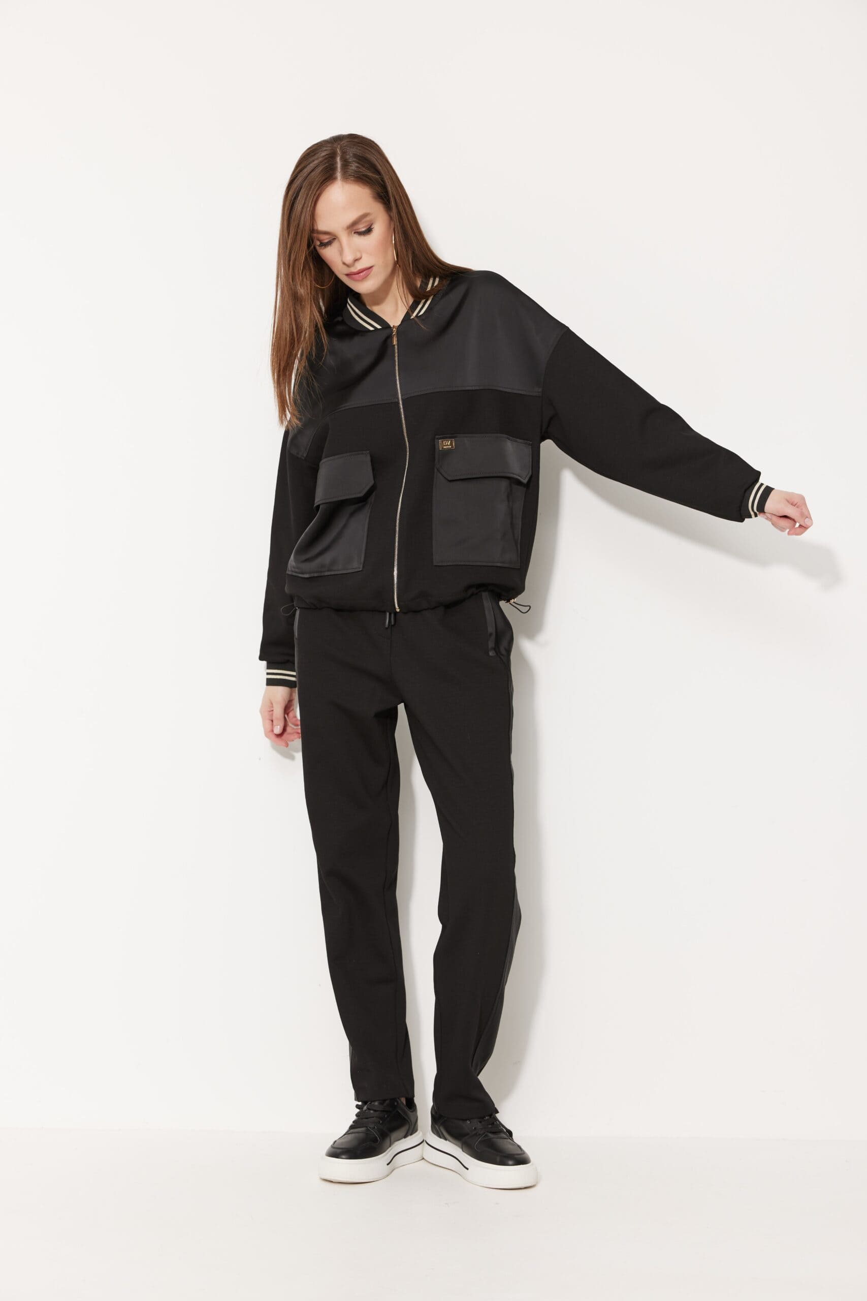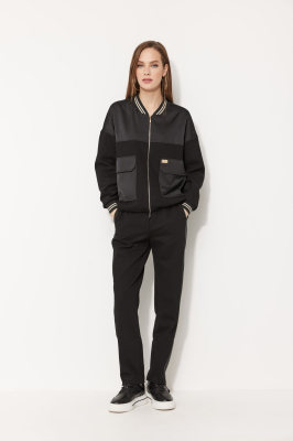 Жакет прямого силуэта, свободного кроя, длиной чуть выше линии бёдер, со спущенной линией плеча, с рукавами длиной до запястья, с прилегающими манжетами из довяза. Застёжка центральная на декоративную молнию. Горловина округлой формы с воротником из довяза, который плавно сведён к центру переда. На передних половинках, на уровне талии, расположены накладные прямоугольные карманы с фигурными клапанами. Спинка без особенностей. Кокетки переда и спинки из отделочной ткани. Низ прямой, застрочен отделочной строчкой, с эластичным шнуром и фиксаторами по боковым швам. По карманам, клапанам, кокеткам прострочена широкая отделочная строчка. Жакет на подкладке.
