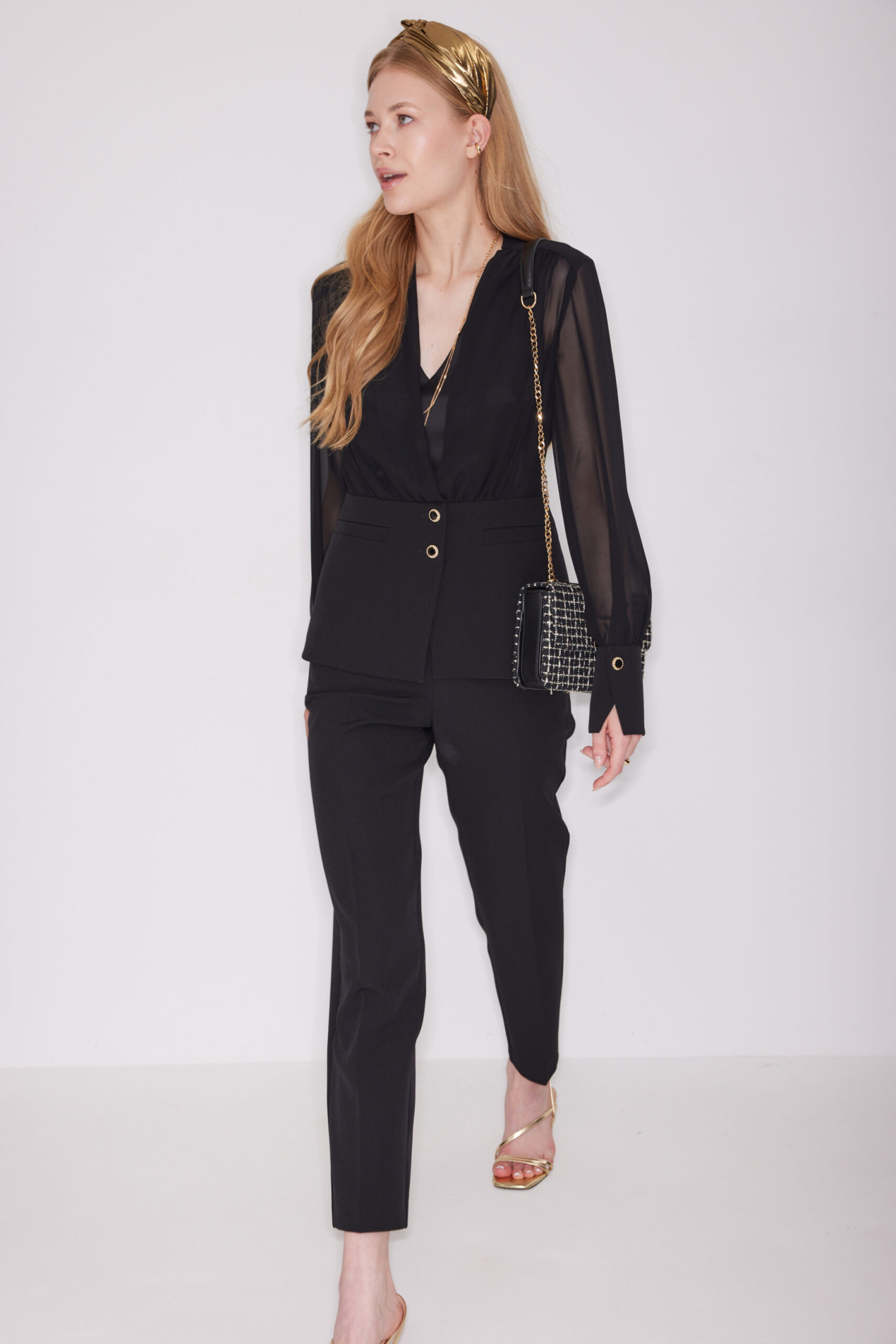 Блузка из матового атласа, прямого силуэта, длиной ниже талии, без рукавов, с V-образной горловиной. Блузка без застёжки. Перед с нагрудными вытачками. Низ блузки прямой с разрезами в боковых швах