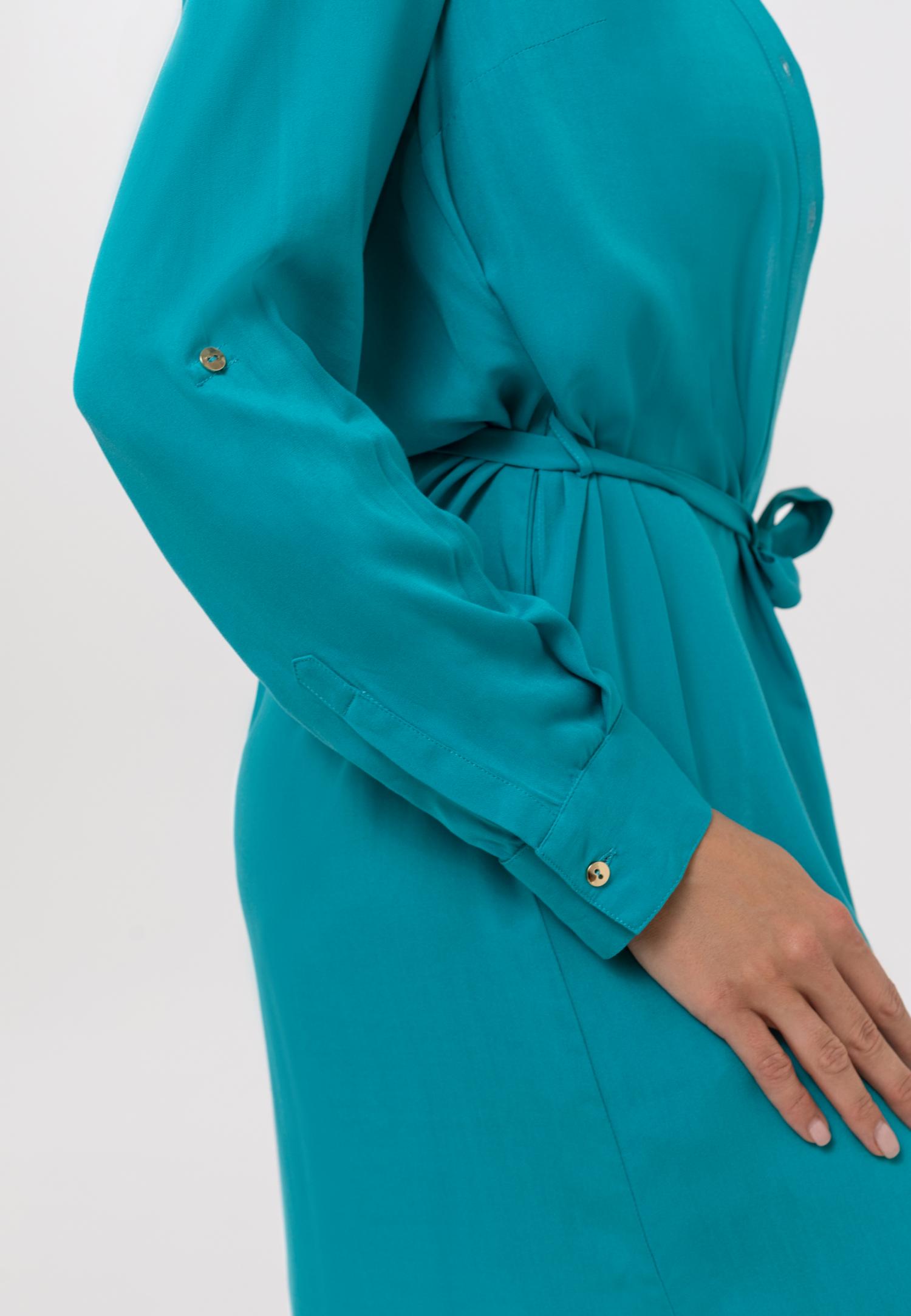 Платье-рубашка на пуговицах из дышащей, мягкой вискозной ткани. Актуальная длина миди. Закругленный подол с разрезами по бокам. Отложной воротник.  Длинные рукава с манжетами на пуговицах. Длина рукава регулируется патой с застежкой. Съемный пояс с золотыми пряжками.