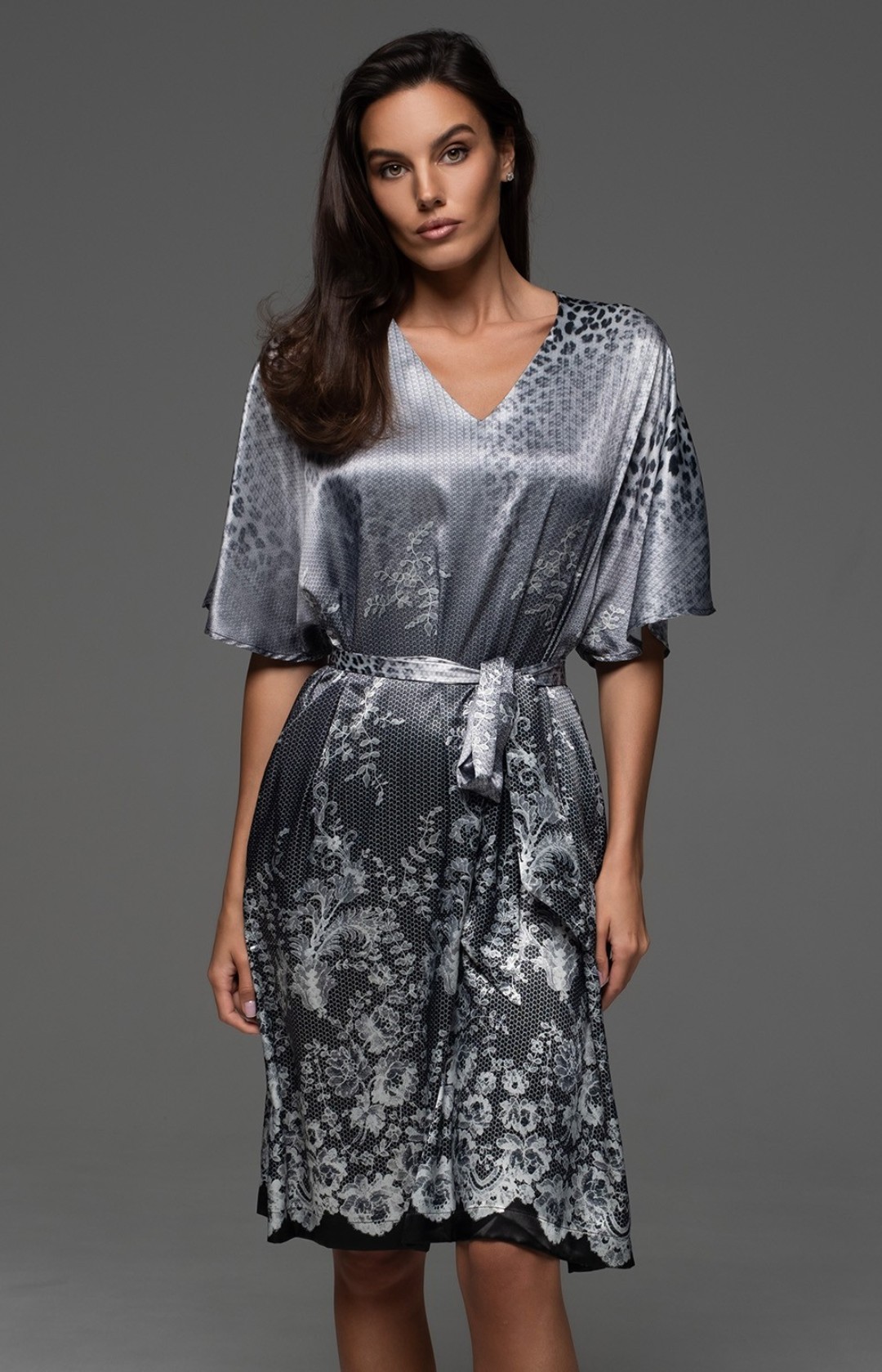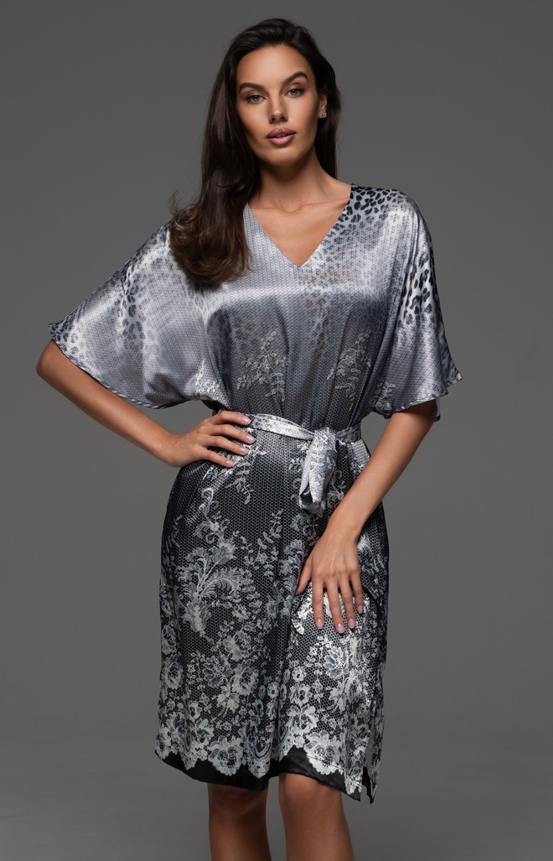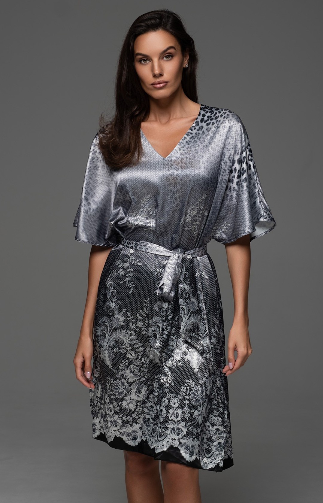 Короткая туника Mia-Amore с короткими рукавами и V-образным вырезом горловины выполнена из принтованного смесового шёлка. По талии прилегание туники регулируется съёмным поясом, в боковых швах карманы.