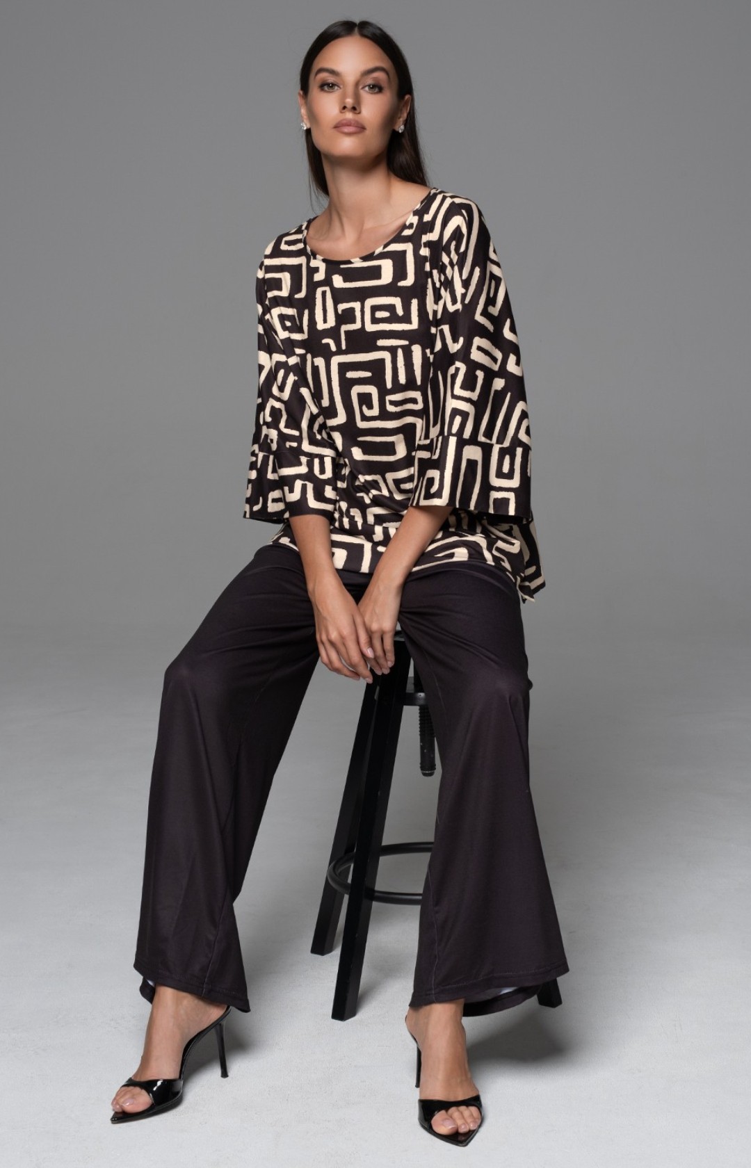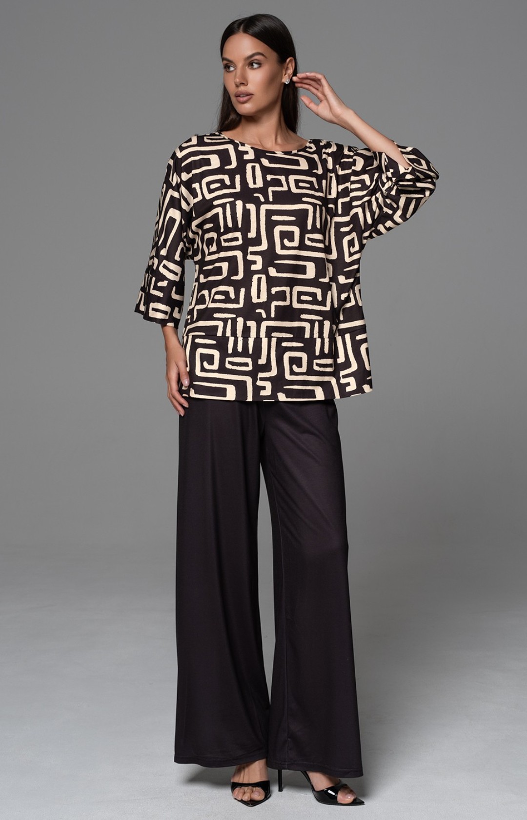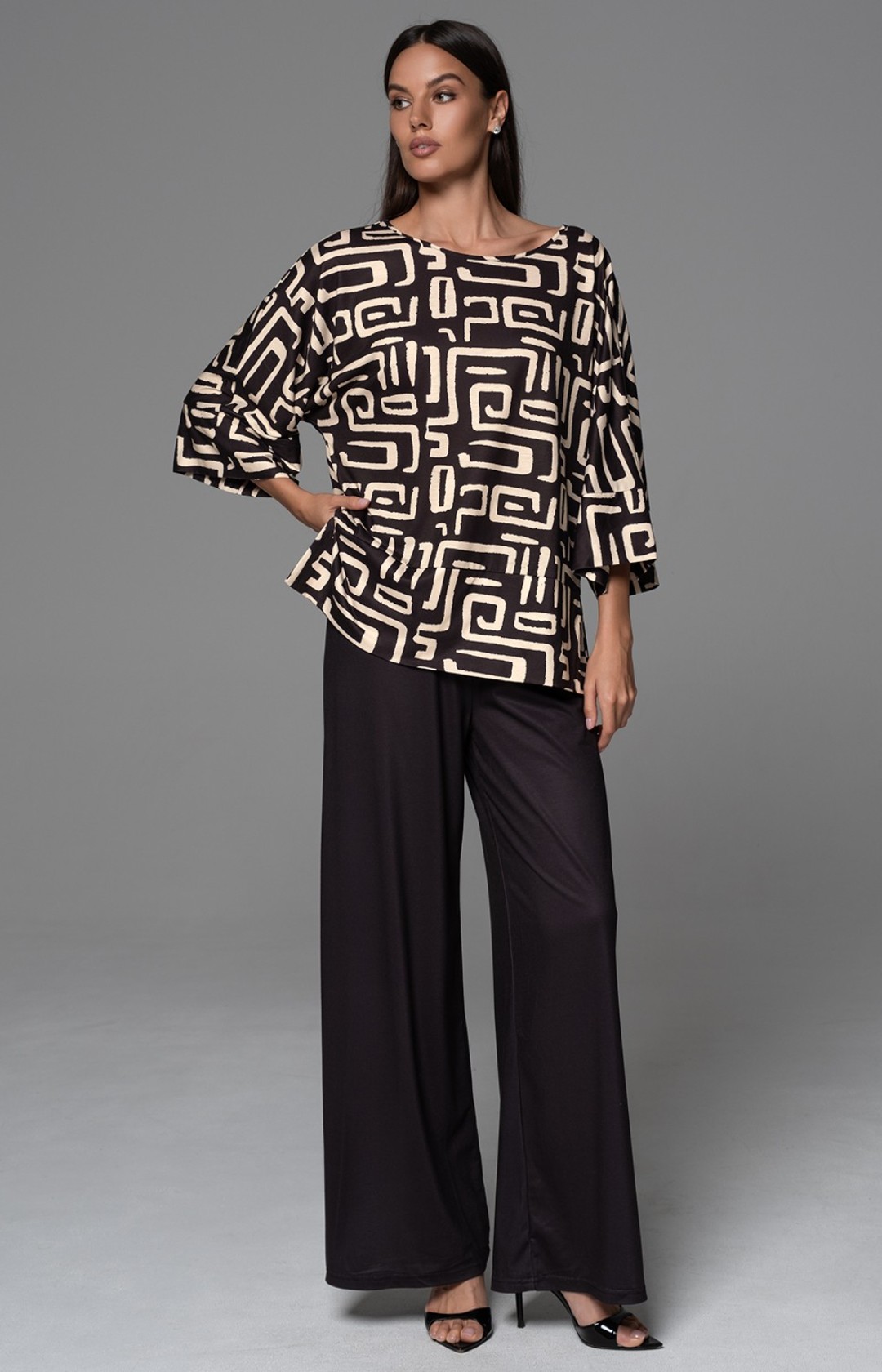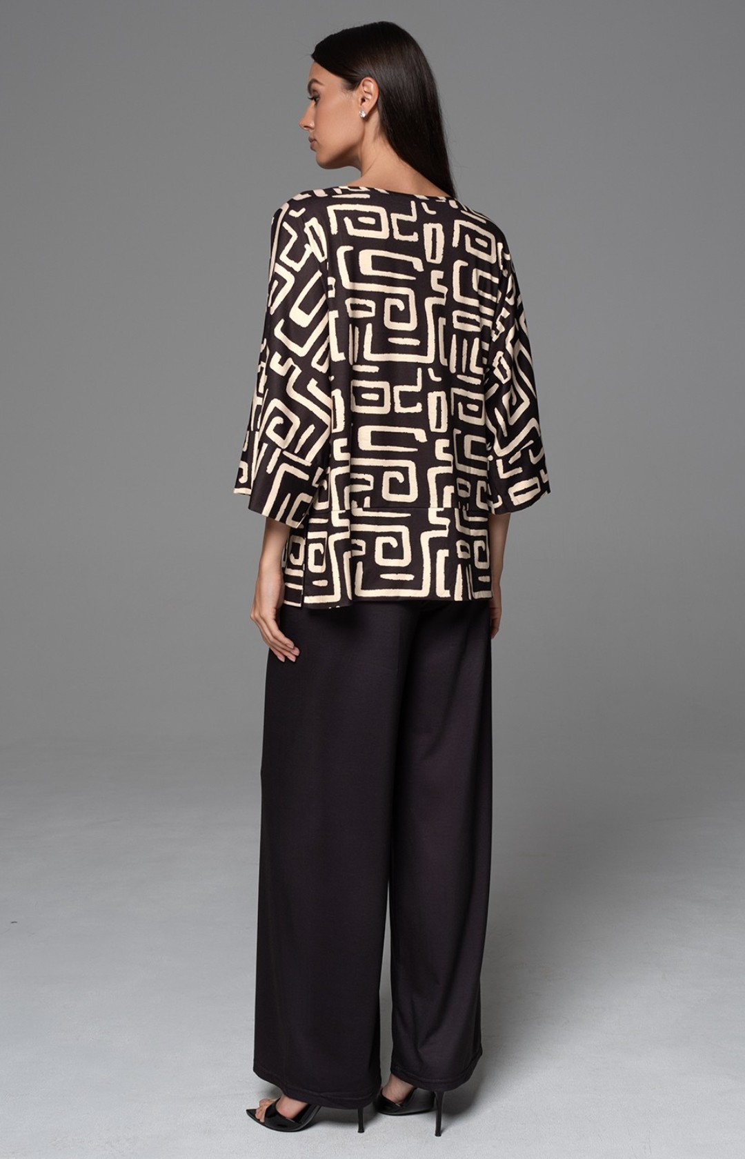 Комплект состоит из свободного топа с рукавом ¾ и широких брюк. Топ выполнен из принтованного трикотажного полотна, брюки полностью однотонные.