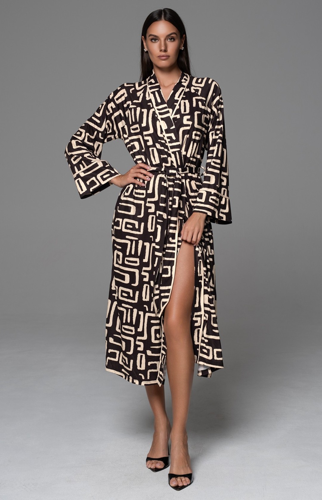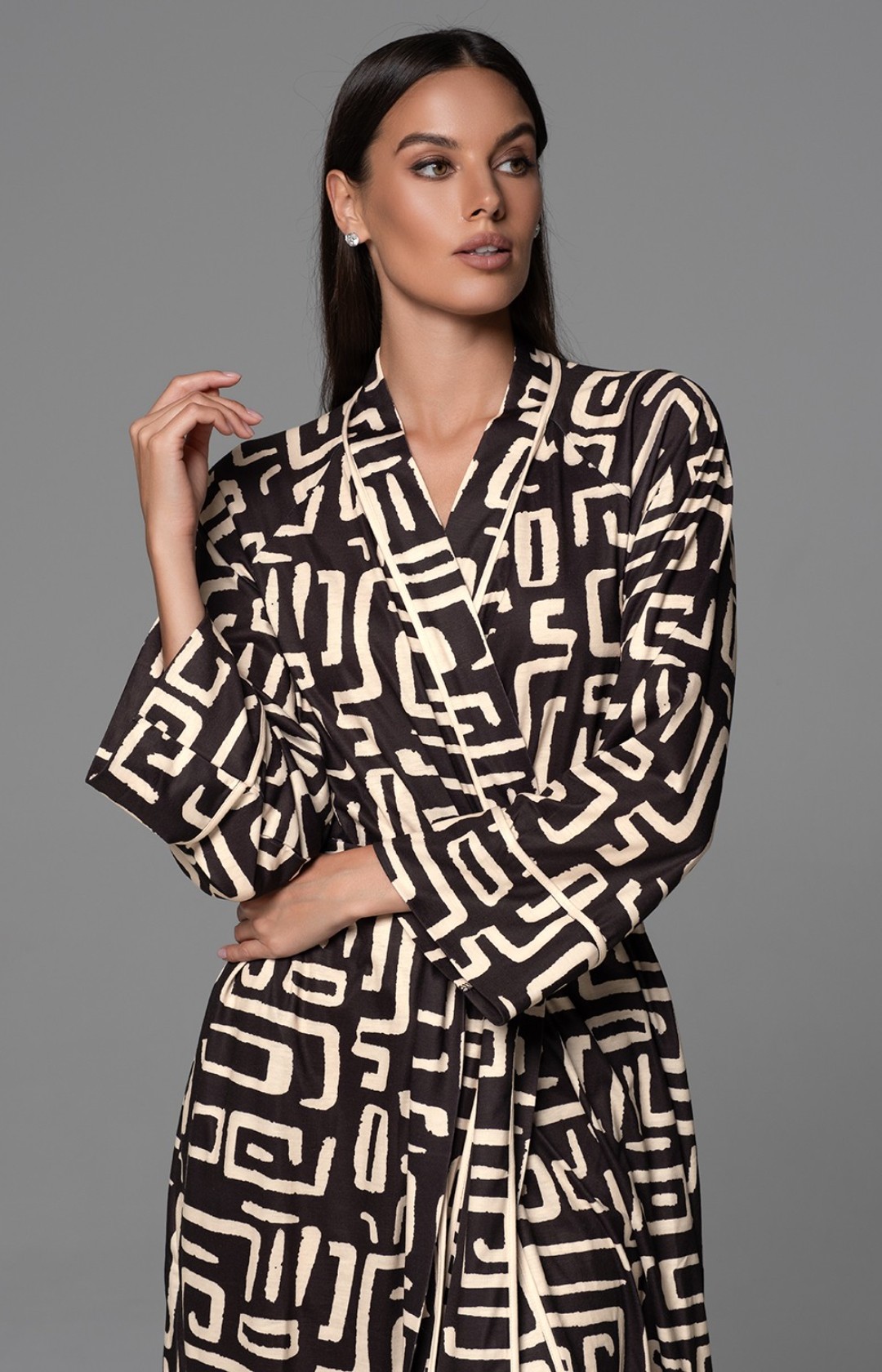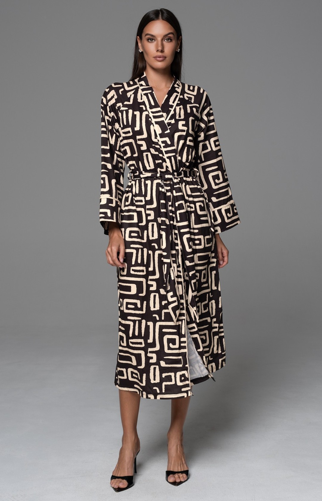 Длинный классический запашной халат с длинным рукавом. Халат выполнен из принтованного трикотажного полотна. В боковых швах расположены карманы.
