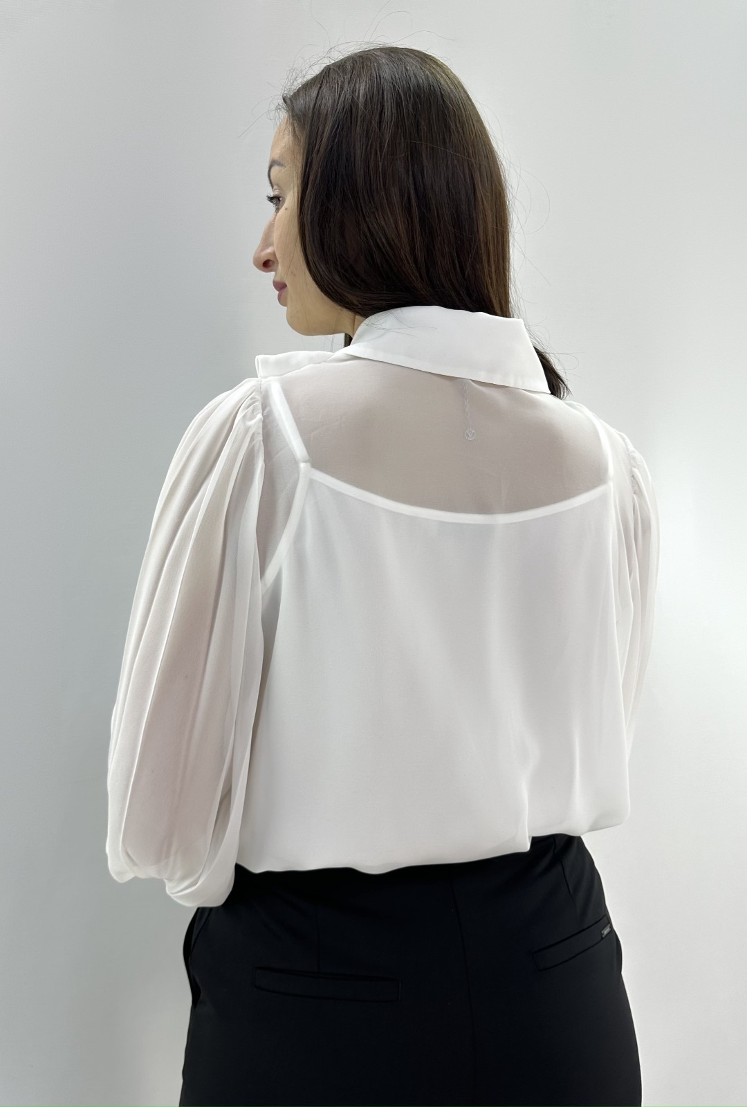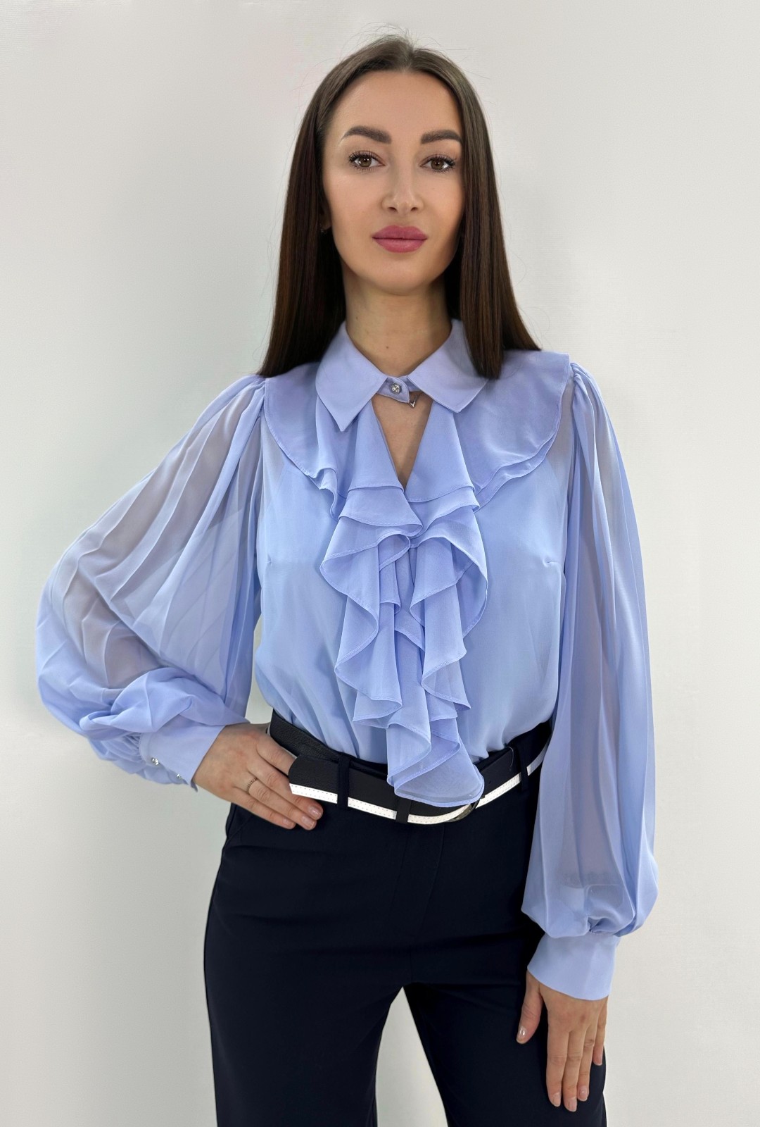 Блузка женская полуоблегающего силуэта из полупрозрачной ткани с майкой в комплекте. V-вырез с отложным воротником на застёжке. На груди волан в два ряда. Рукав свободный, слегка плиссированный, на манжете.