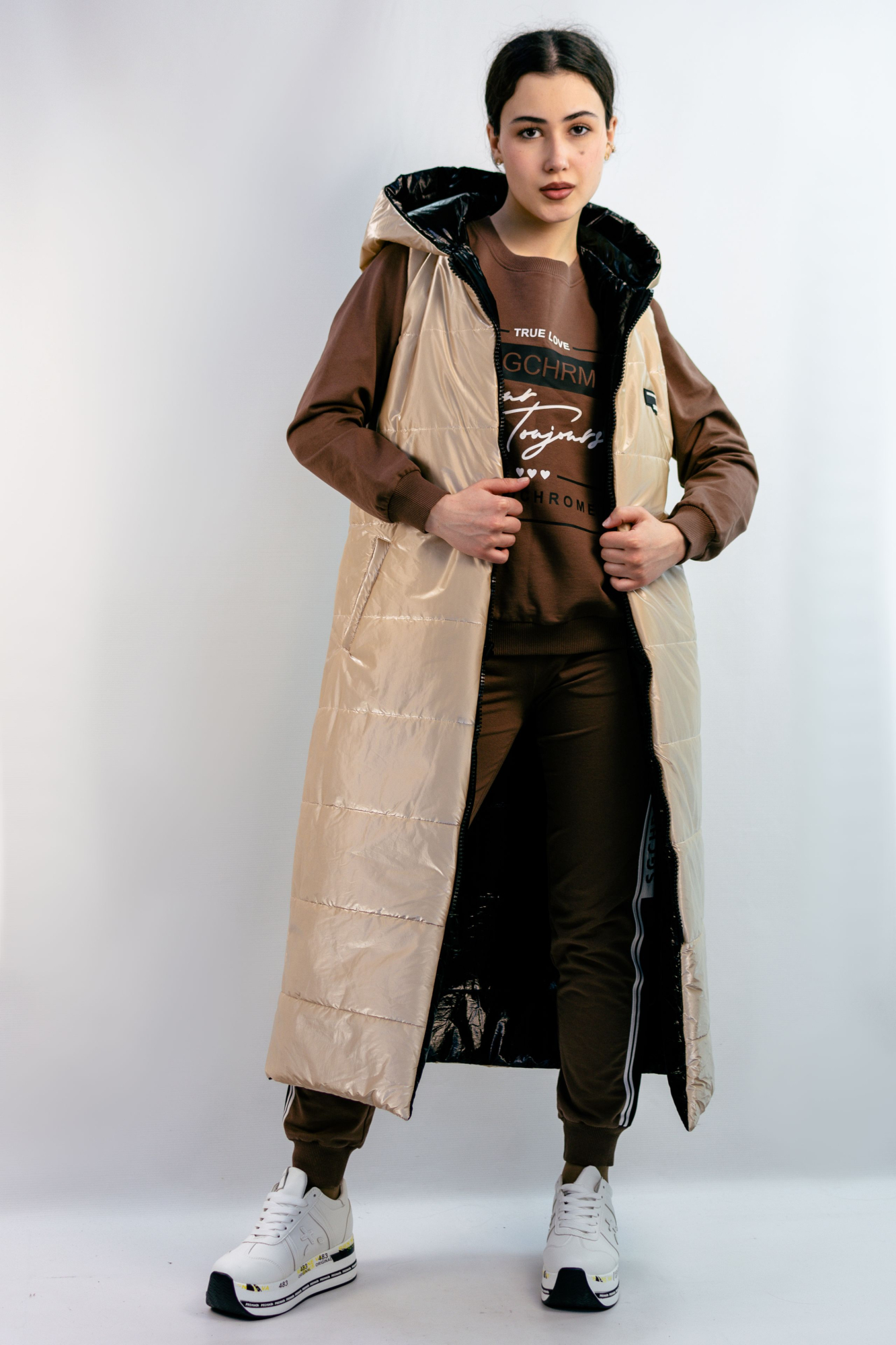 Комплект - спортивный костюм + двухсторонний жилет. Костюм трикотажный состоит из прямых  брюк с карманами и толстовки с округлым вырезом. Жилет на синтепоне не продувается ветром и создает дополнительную защиту удерживая тепло вашего тела. Жилет удлиненный на замке с капюшоном.